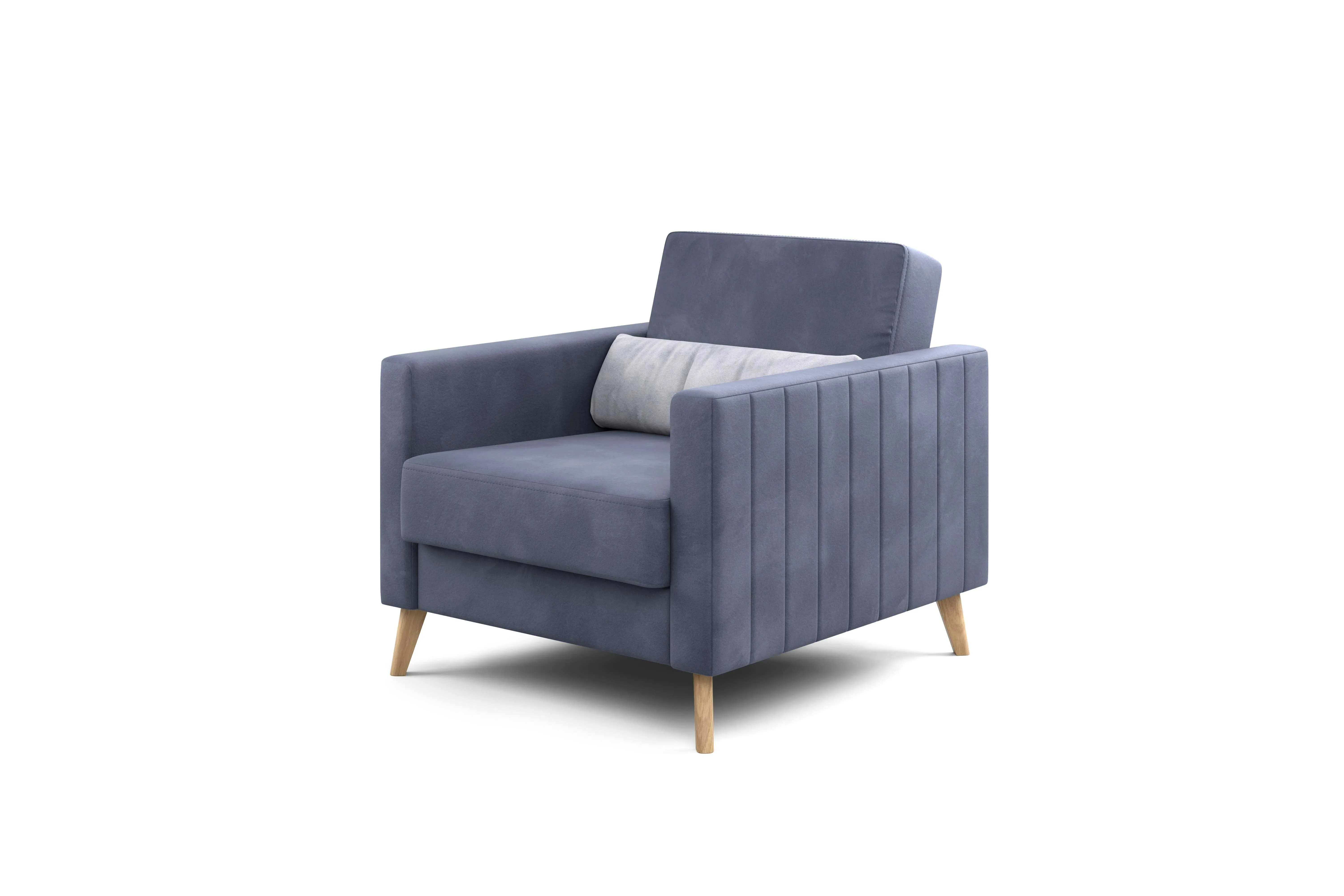 Кресло имеет простой и элегантный силуэт. Обивка из велюра не только роскошно выглядит, но еще и практична в эксплуатации, а также имеет отличные показатели износоустойчивости. Высокие опоры из массива березы придают креслу визуальную лёгкость, декоративная отстрочка на боковинах придает приятный объем. Подушки из велюра контрастного цвета входят в комплект.