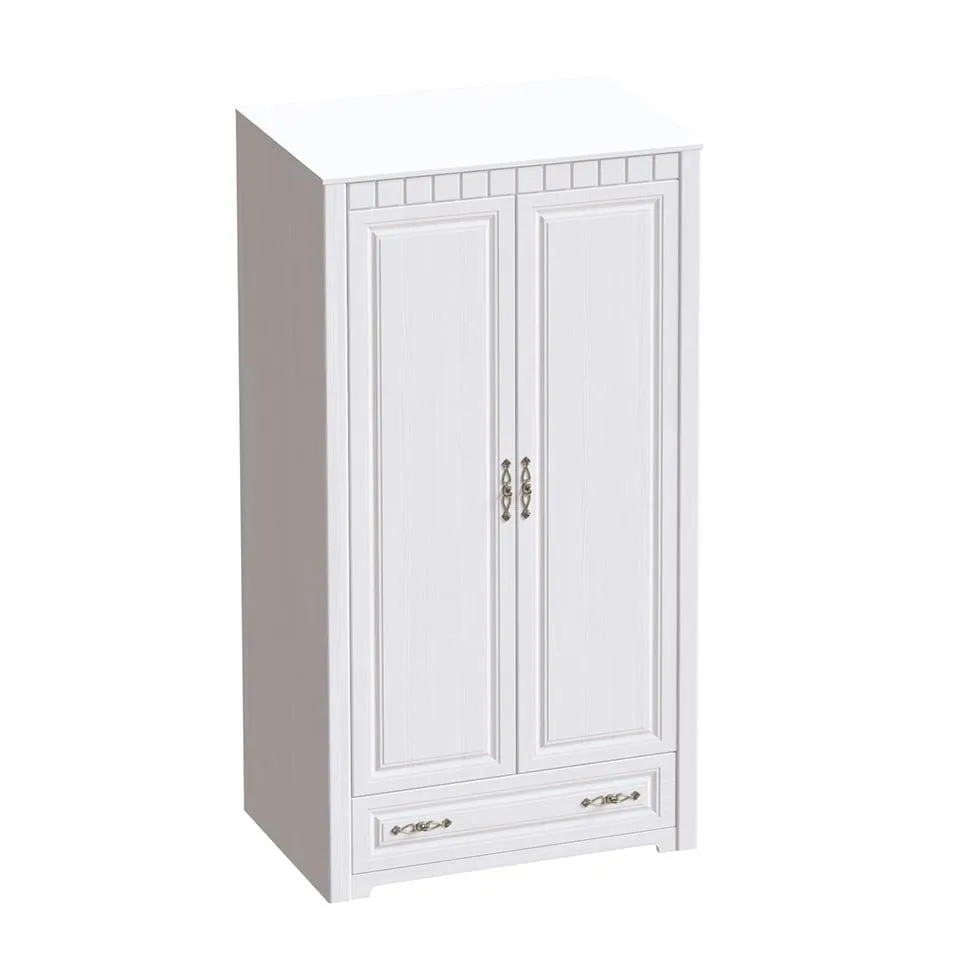 В шкафу расположены две распашные двери и в нижней части ящик на шариковых направляющих глубиной 500 мм. За распашными дверьми расположено отделение для одежды со стальной штангой.