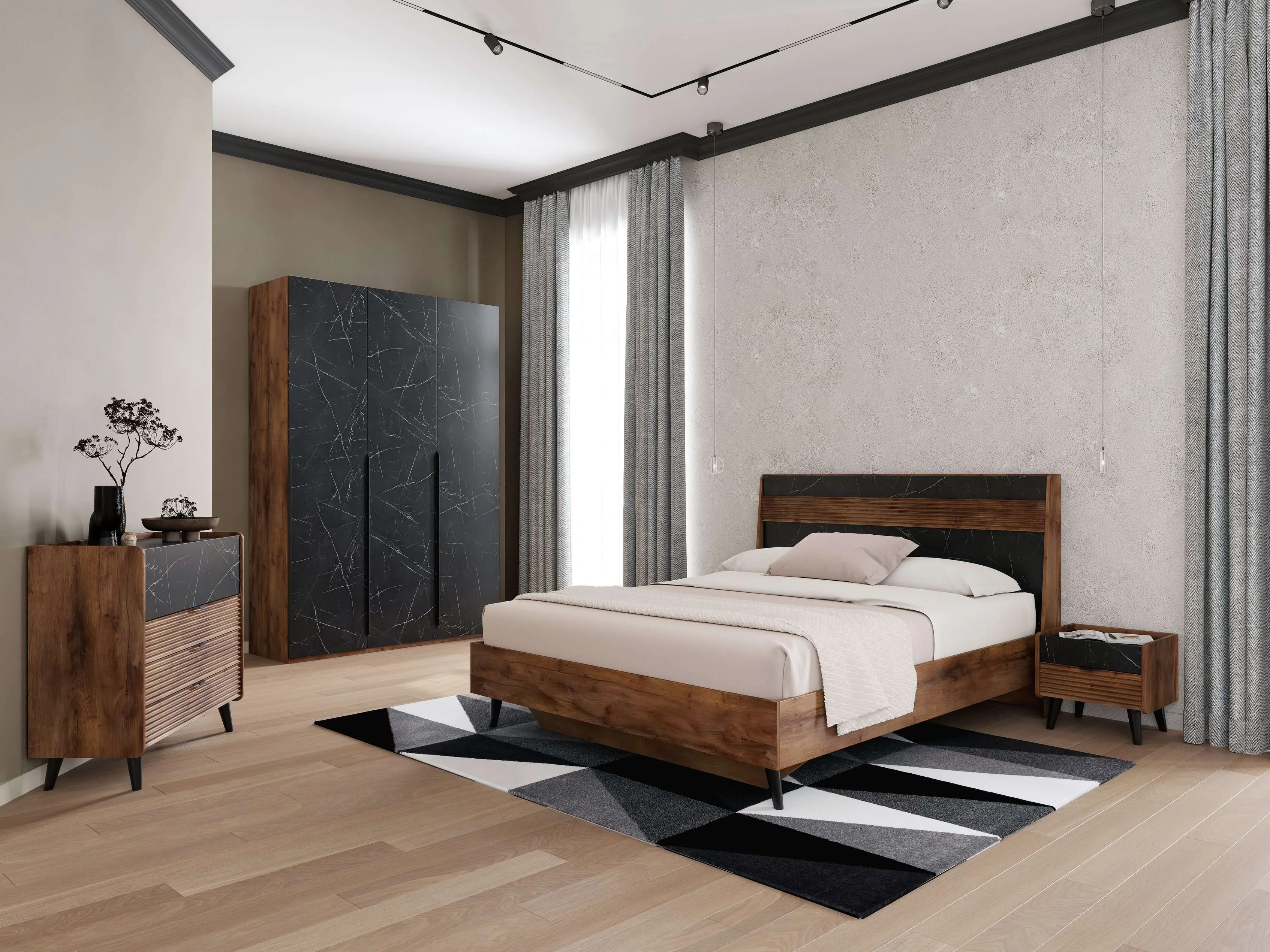 Серия мебели для спальни “Браун” в цвете Таксония/Мрамор неро маркина представляет собой элегантное и стильное решение для создания уютной атмосферы в вашей спальне. Мрамор придает мебели изысканный и роскошный вид, а Таксония добавляет теплые нотки и создает гармоничное сочетание с черным цветом.